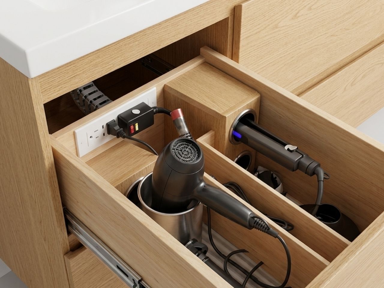 Plan for outlets inside drawers for hair dryers and electric toothbrushes. Also, consider an outlet near the toilet if you’re dreaming of a smart bidet.